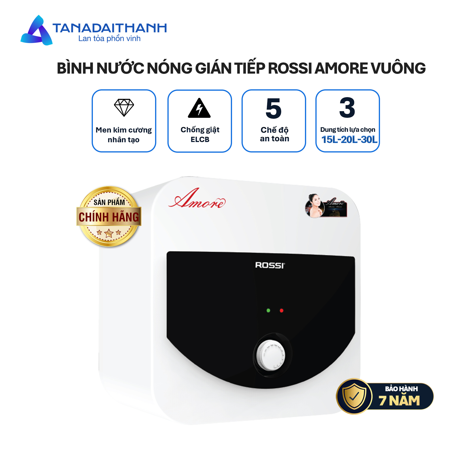 Bình nóng lạnh gián tiếp Rossi Amore Vuông 30 L (RAM‑30SQ) là lựa chọn lý tưởng cho gia đình từ 3–5 người cần nguồn nước nóng dùng thường xuyên. Sản phẩm được sản xuất tại Việt Nam theo tiêu chuẩn Tân Á Đại Thành với công nghệ Italy và quy trình đạt tiêu chuẩn quốc tế ISO 9001:2015. Ruột bình tráng men kim cương nhân tạo kết hợp thanh gia nhiệt hai lớp inox giúp tăng độ bền và hiệu suất, giảm cặn bẩn. Lớp cách nhiệt polyurethane mật độ cao giữ nhiệt tới 72 giờ, giúp nước luôn ấm mà vẫn tiết kiệm năng lượng. Hệ thống bảo vệ an toàn gồm cầu dao chống rò ELCB siêu nhạy, bộ ổn nhiệt thông minh nhập khẩu từ Pháp có khả năng ngắt tự động khi đạt nhiệt độ hoặc khi không có nước, chống cháy khô. Van an toàn Italy duy trì áp lực ổn định, tránh các sự cố áp suât lớn. Người dùng dễ dàng điều chỉnh nhiệt độ bằng núm vặn phía mặt trước, cùng đèn báo đỏ/xanh thể hiện tình trạng đun nóng/sẵn sàng. Thiết kế vuông hiện đại, màu trắng–đen trang nhã phù hợp mọi không gian phòng tắm, dễ lắp đặt và bảo hành (7 năm ruột bình, 1 năm linh kiện điện) với hệ thống dịch vụ rộng khắp toàn quốc.